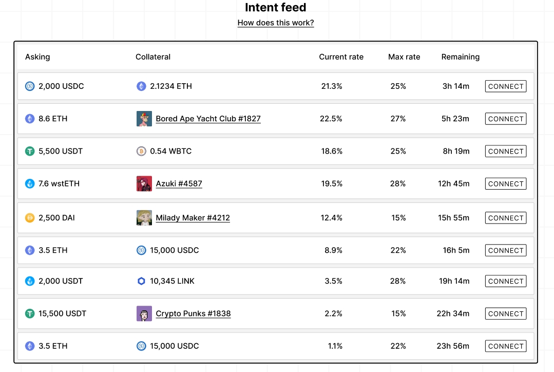 The Intent Feed allows lenders to instantly see what terms borrowers are asking for and immediately fill loans without waiting.